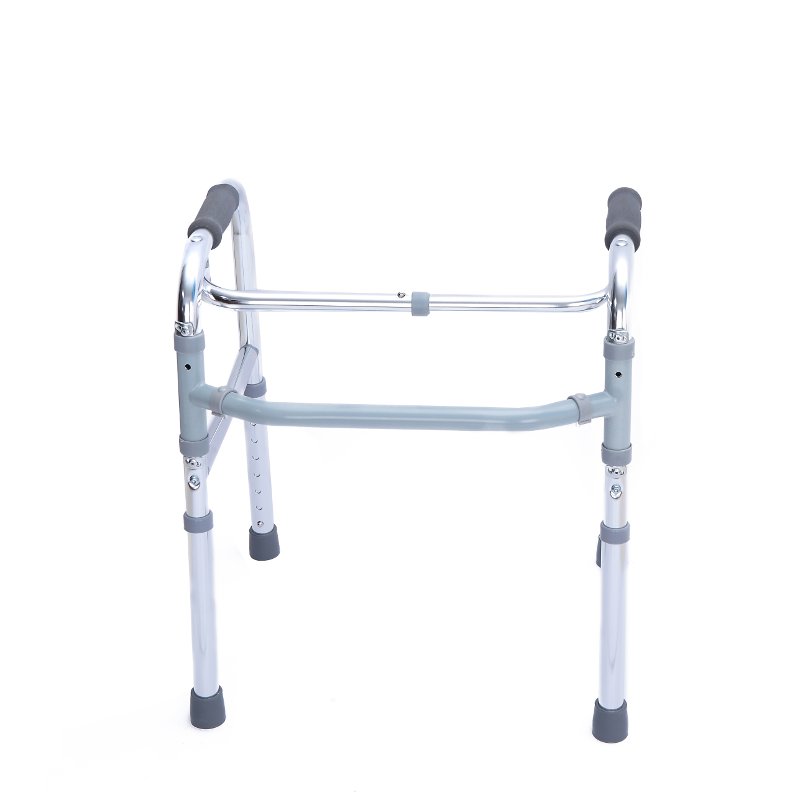 Este andador plegable de aluminio ofrece mucha estabilidad al caminar. Deben utilizarse ambos brazos para usarlo, ya que se debe levantar y mover a cada paso.